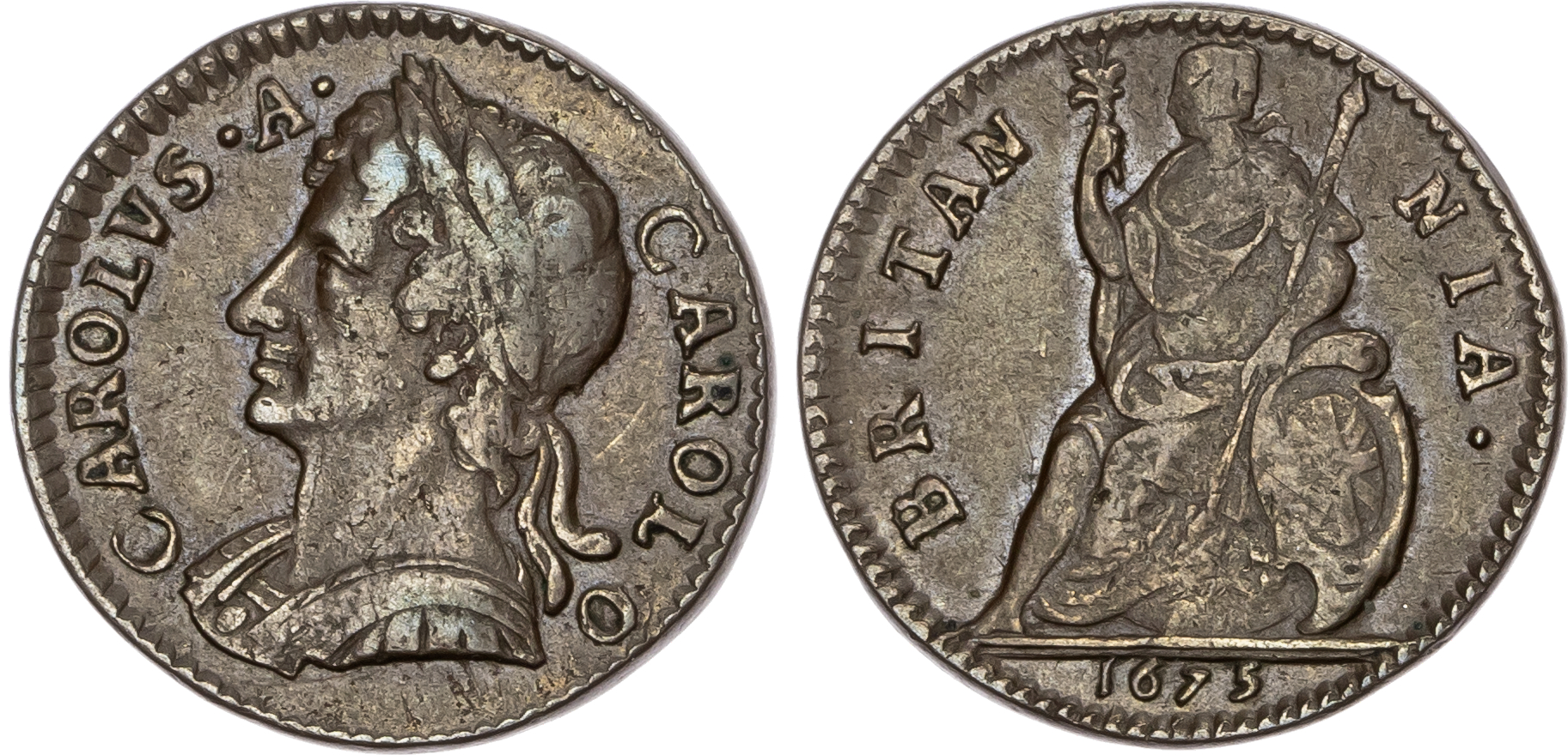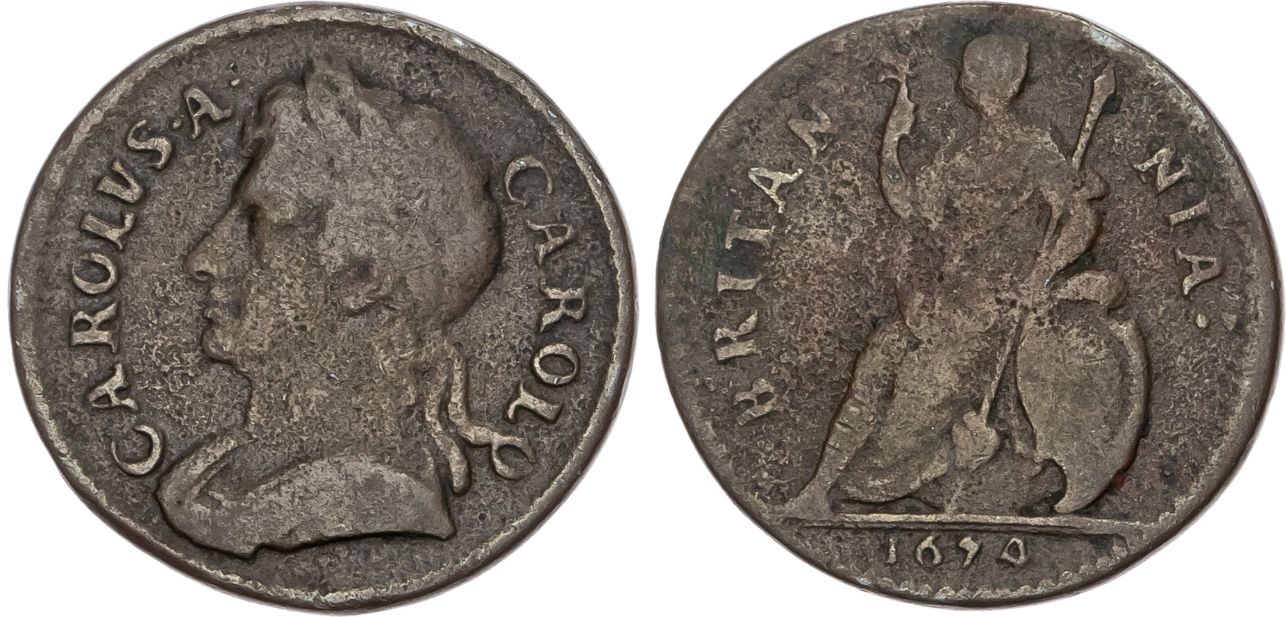 Currency Farthings were struck in Tin or Copper. Pattern Farthings in tin, copper, brass, white metal, silver and gold were also struck (see section on Charles II Pattern Farthings).