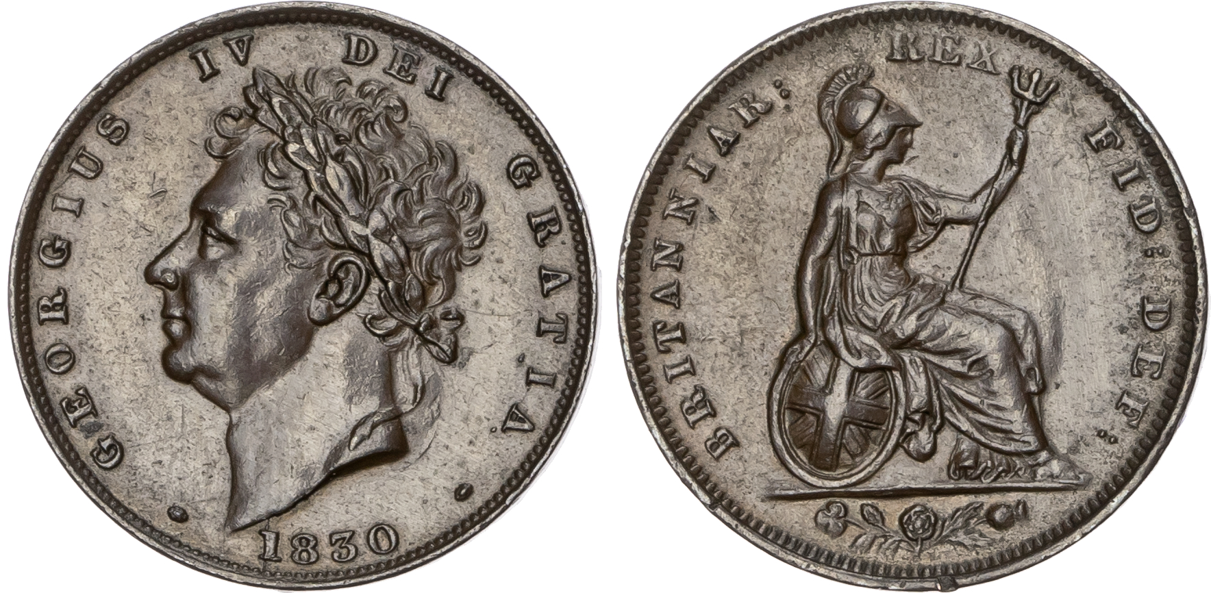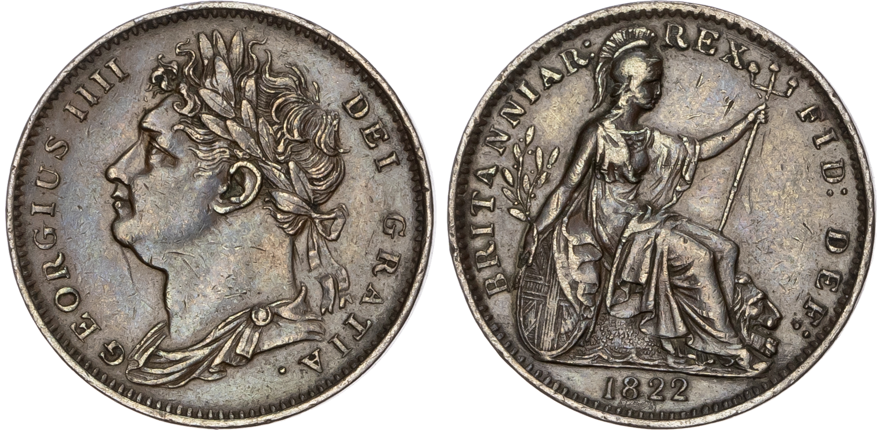 Britannia is now helmeted and for the first time faces right. The ship has sailed! Fidei Defensor makes its first appearance. This is the last reign to have the king's portrait draped.