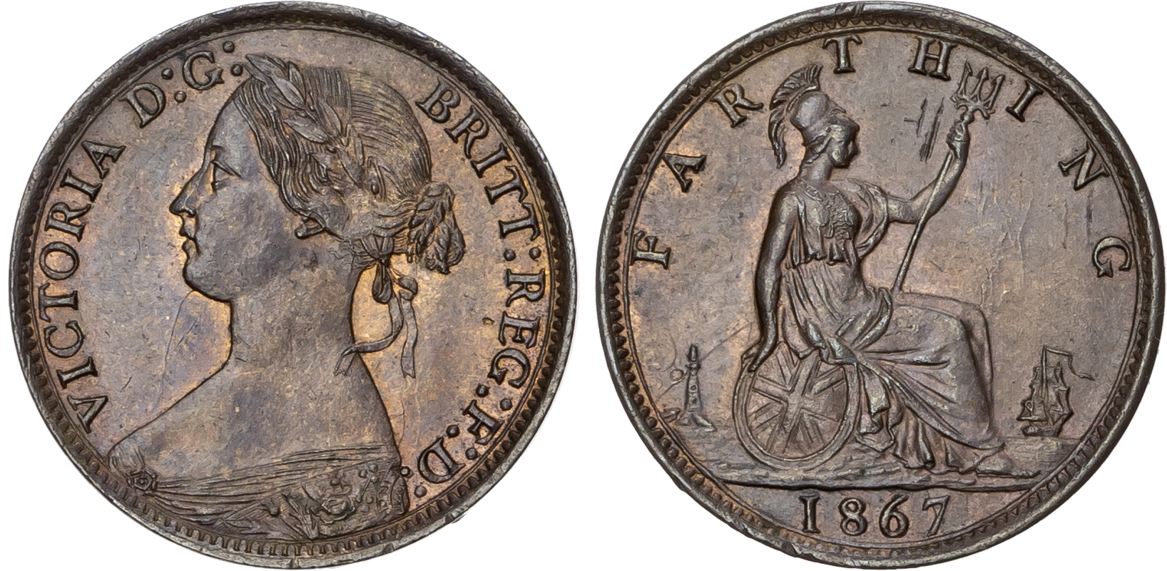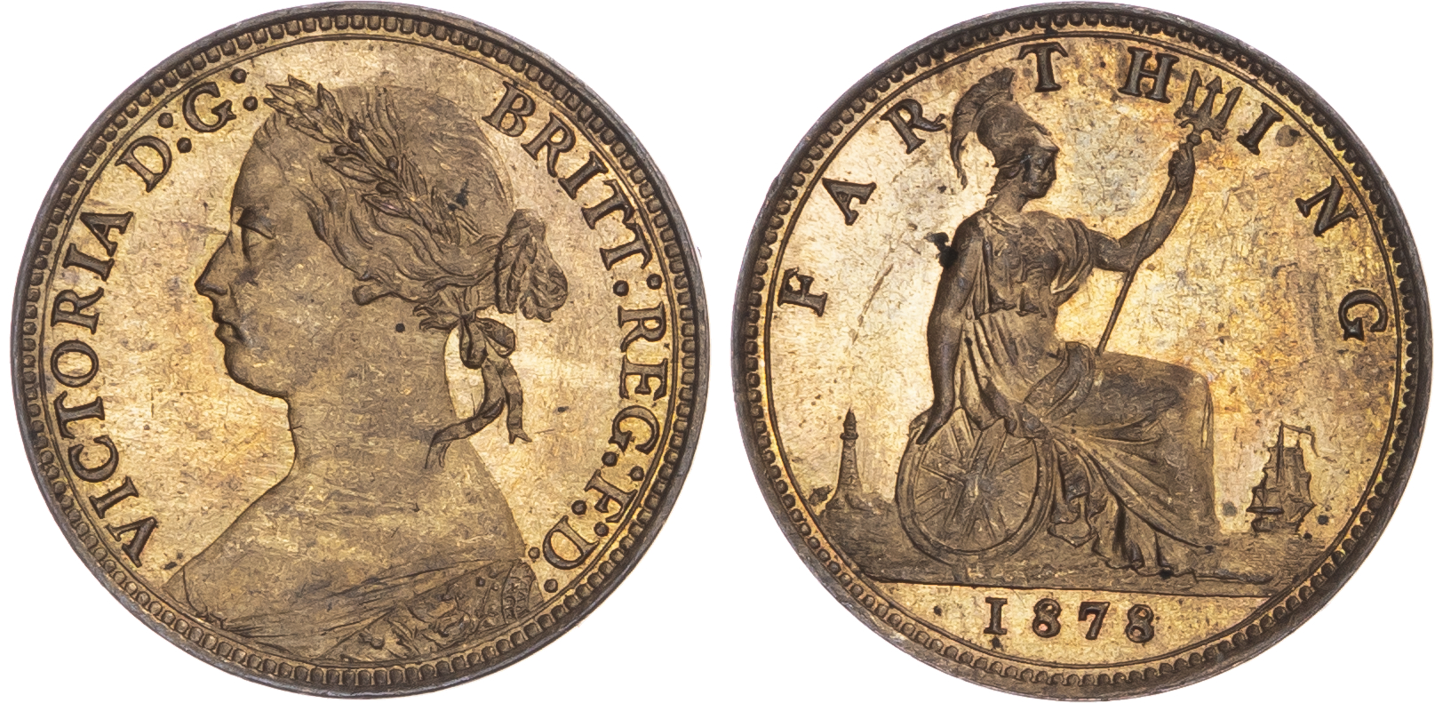 All the Royal Mint issues of 1875 - 1878 have a forked tail to the R of FARTHING. This applies to 1875SD (4B and 5B), 1877, and 1878. It does not apply to the 1875LD or any of the Heaton mint issues of this same period.