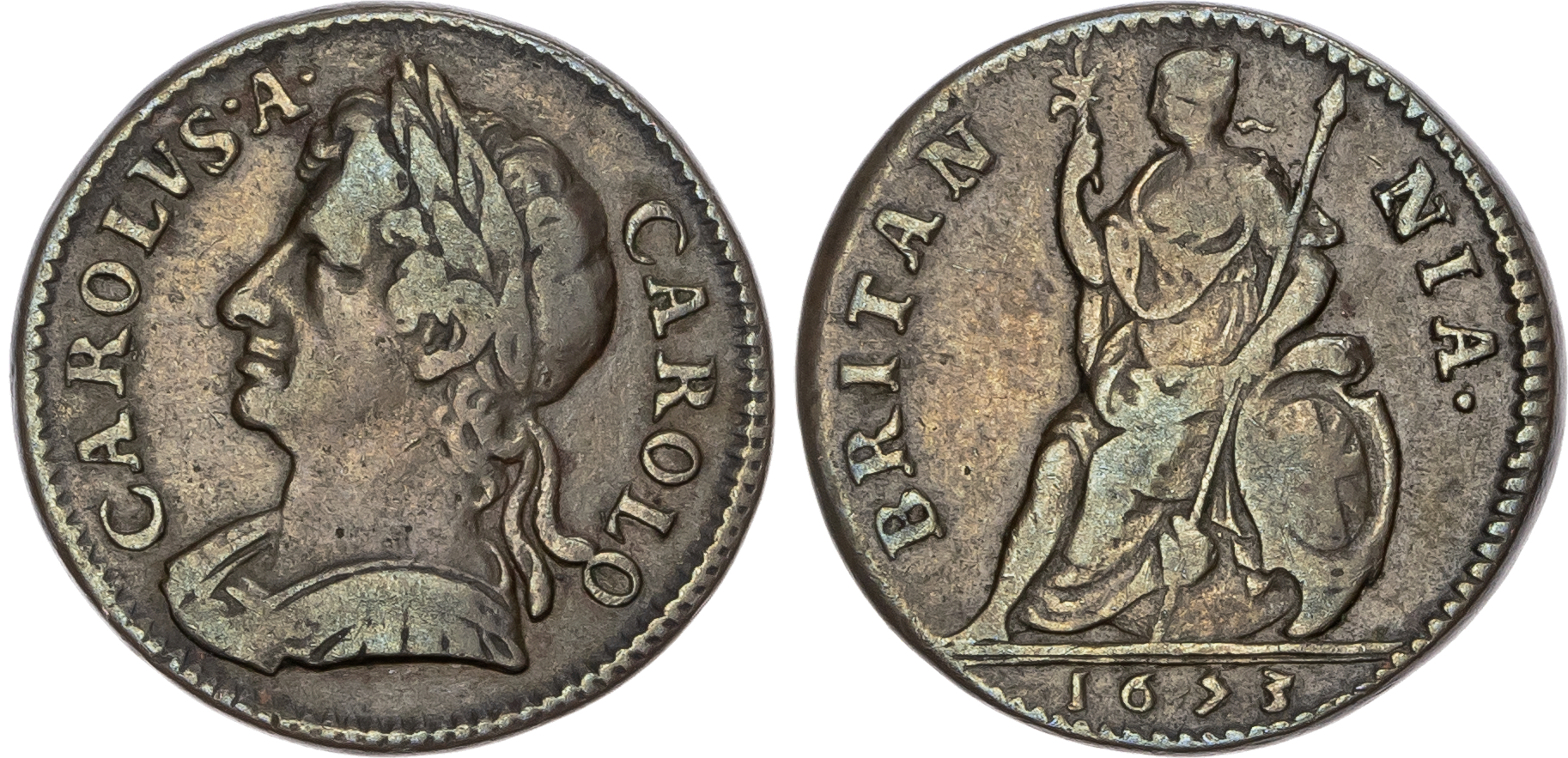Currency Farthings were struck in Tin or Copper. Pattern Farthings in tin, copper, brass, white metal, silver and gold were also struck (see section on Charles II Pattern Farthings).
