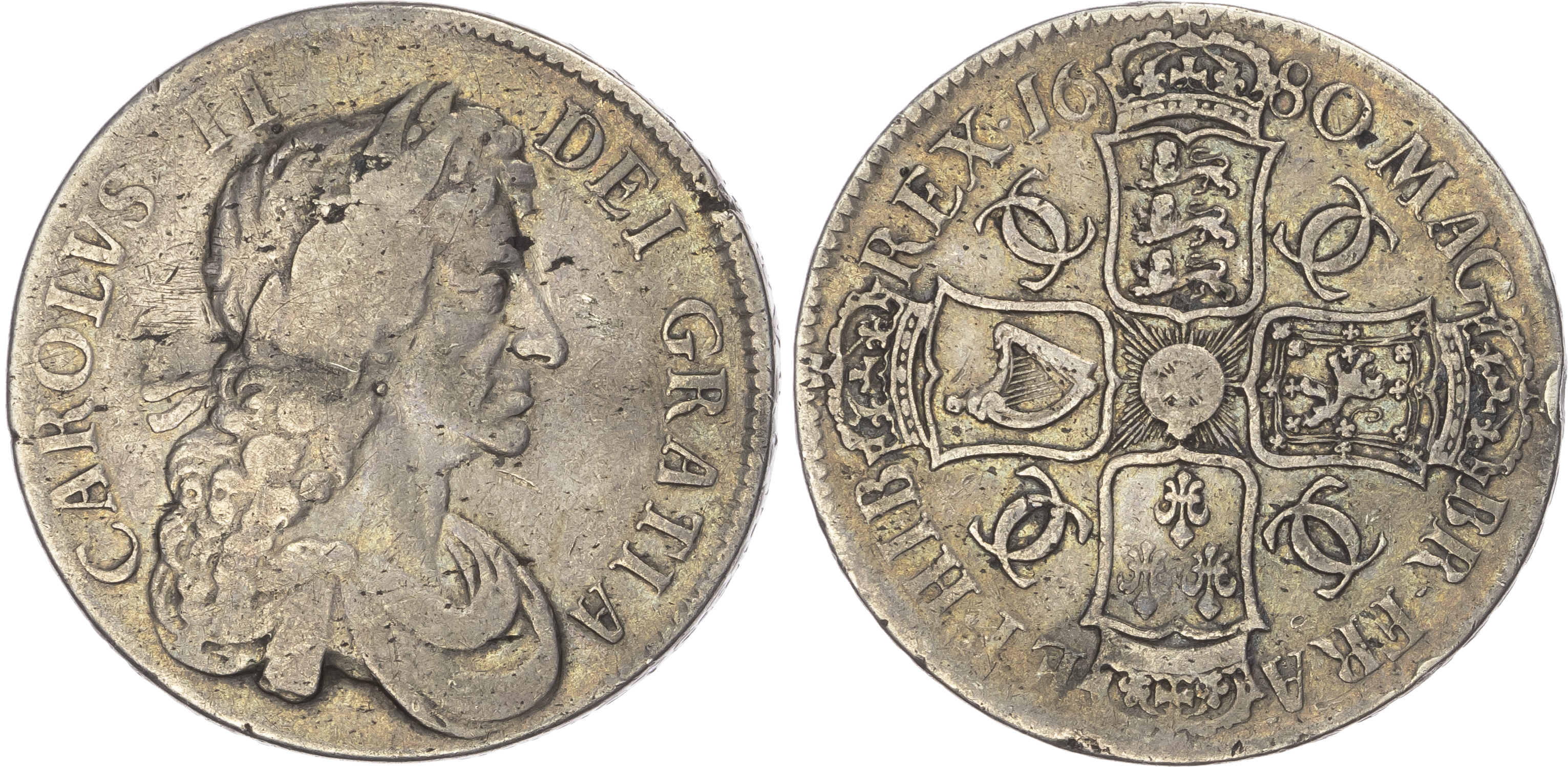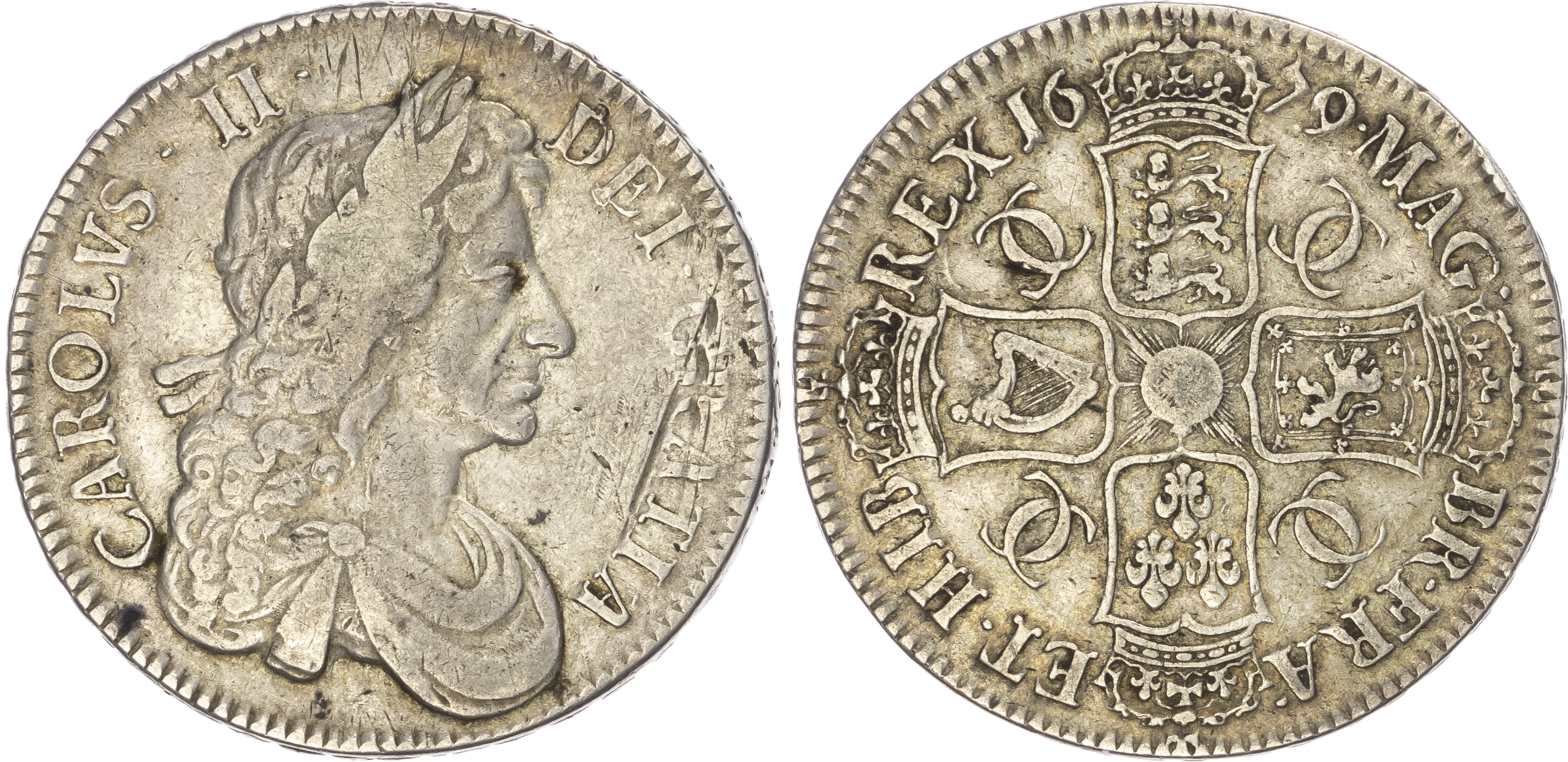 Click here to view picture 1679 Charles II Crown. T. PRIMO. Third dr. bust. Ten harp strings. S3358. ESC 56. Bull 403. Near EF, toned.