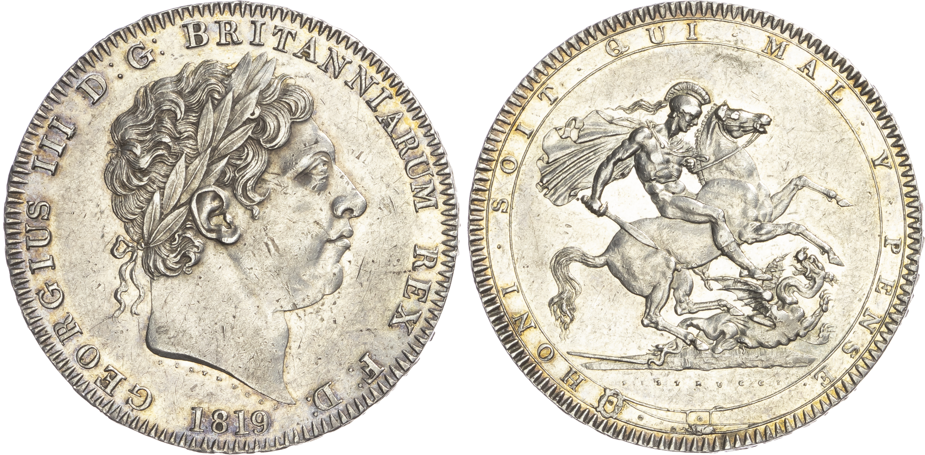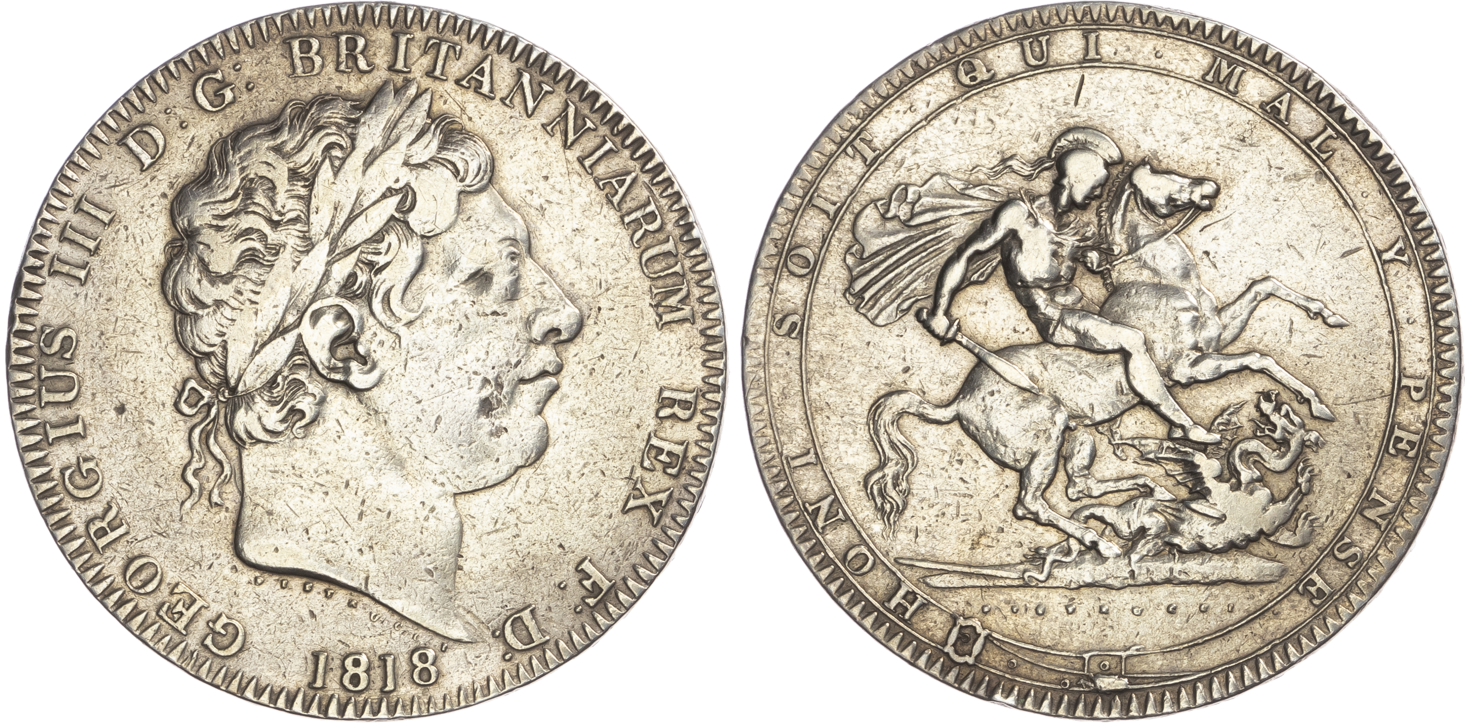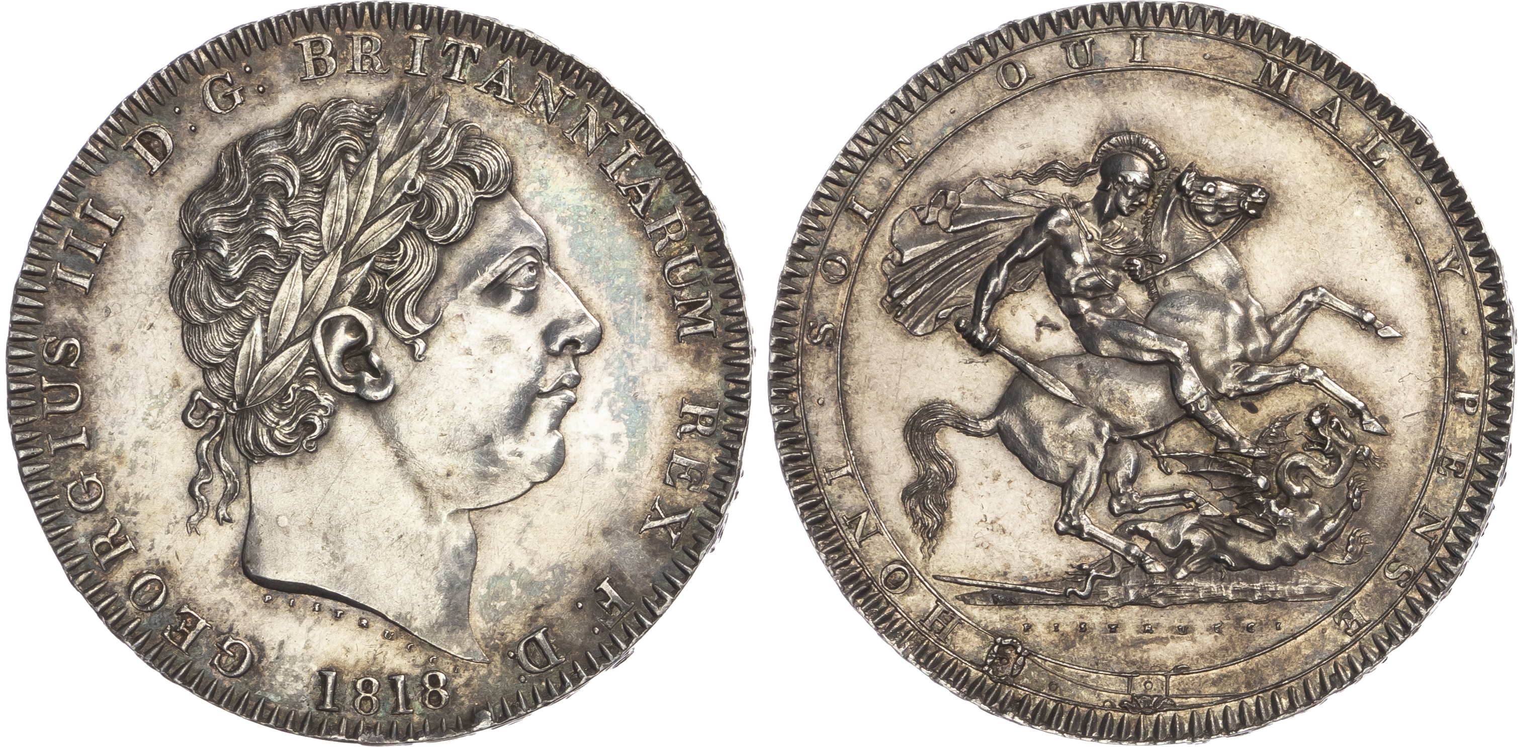 Click here to view picture 1818 LVIII. George III. Laur. head. S3787. GEF attractively toned, two digs to right of bust and one or two marks on the reverse. £450.00