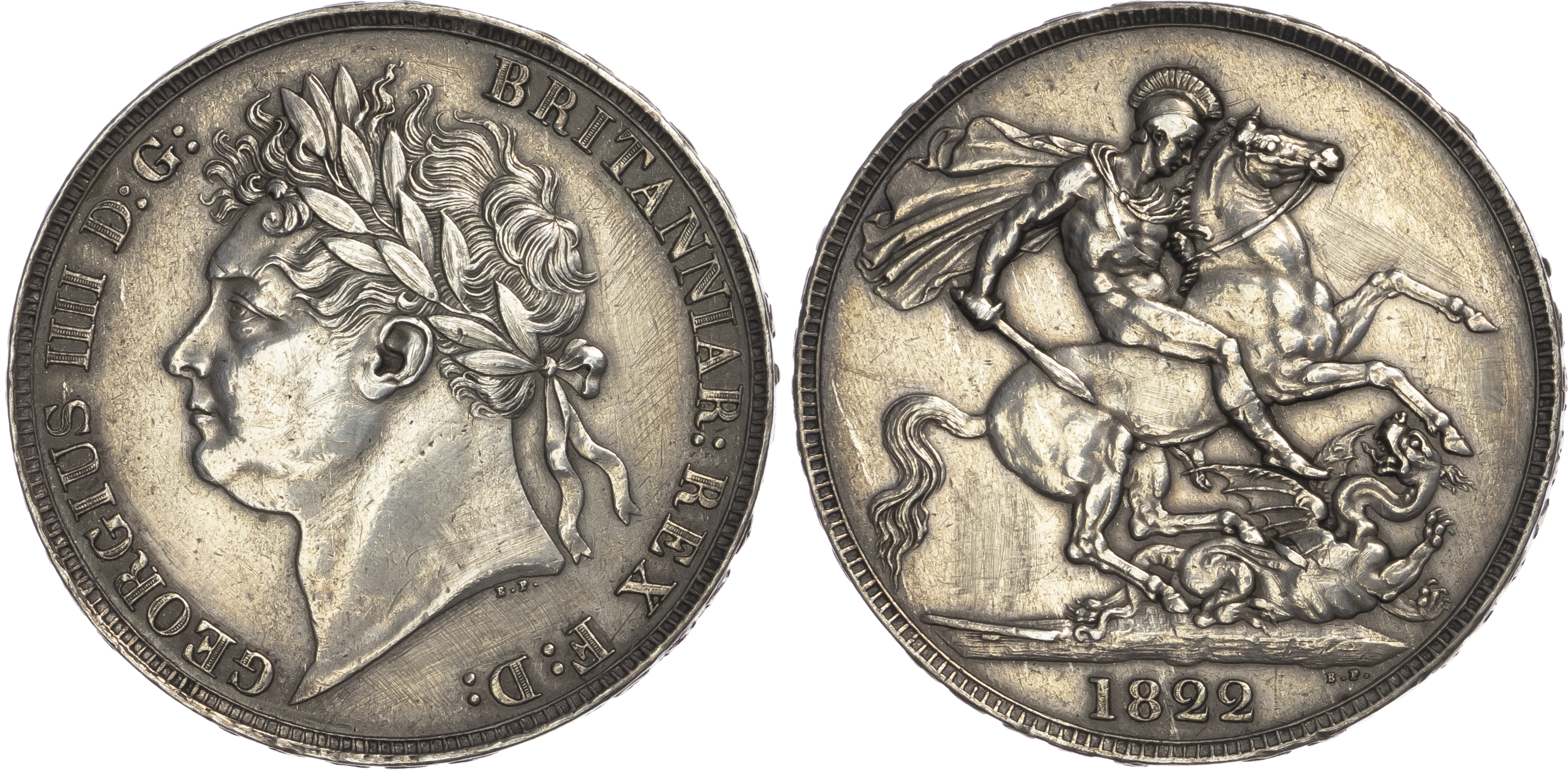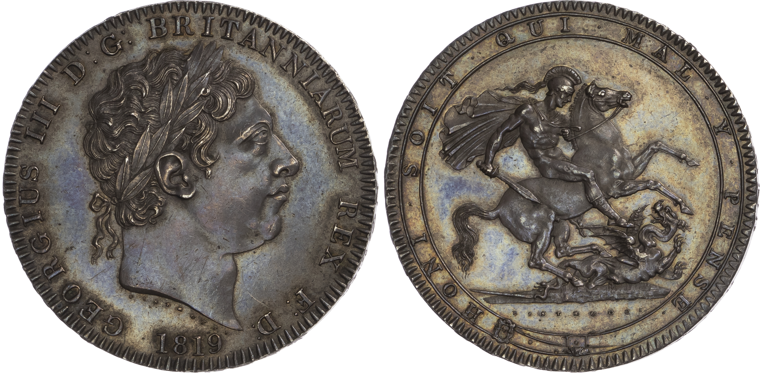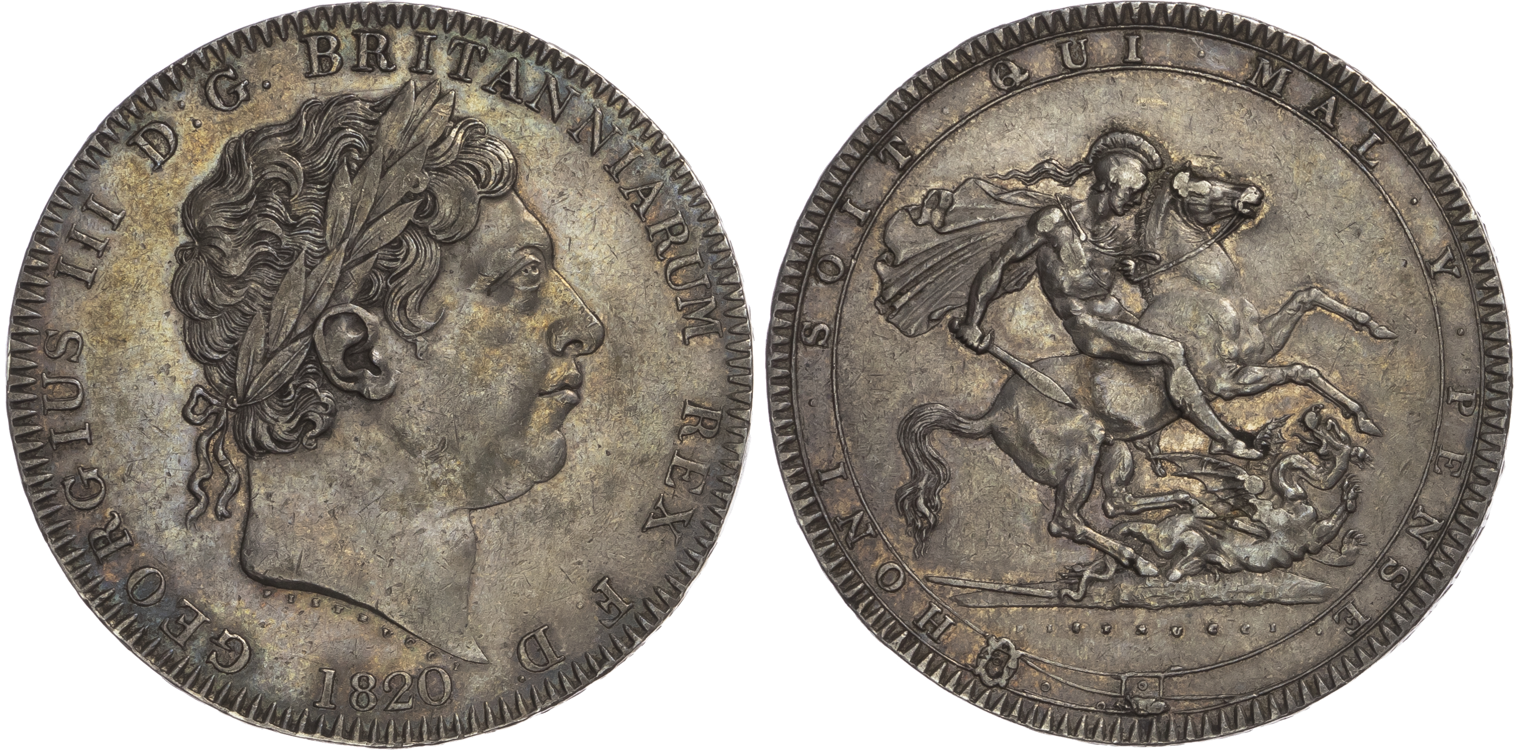 Click here to view picture 1818 LVIII. George III. Laur. head. S3787. GEF attractively toned, two digs to right of bust and one or two marks on the reverse. £450.00