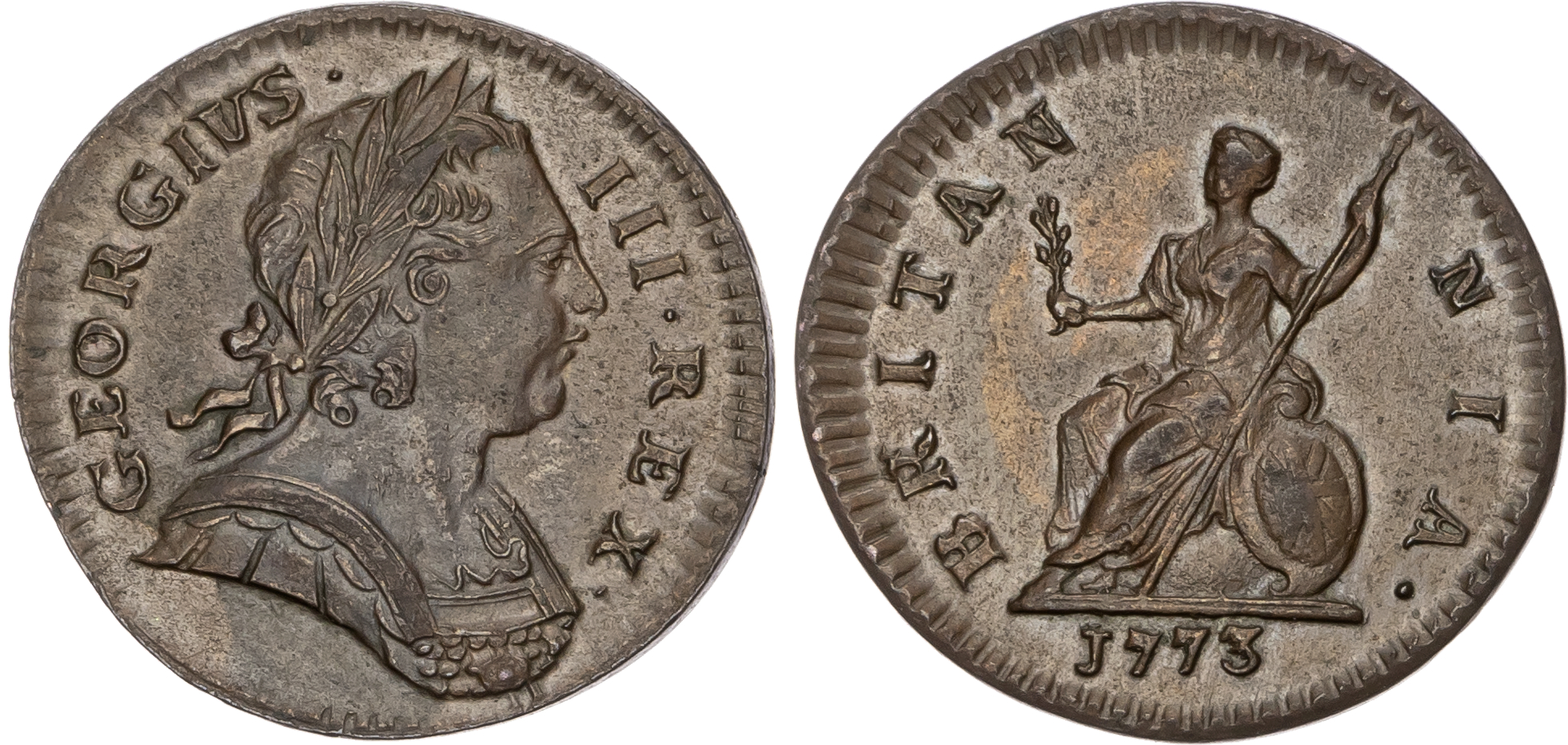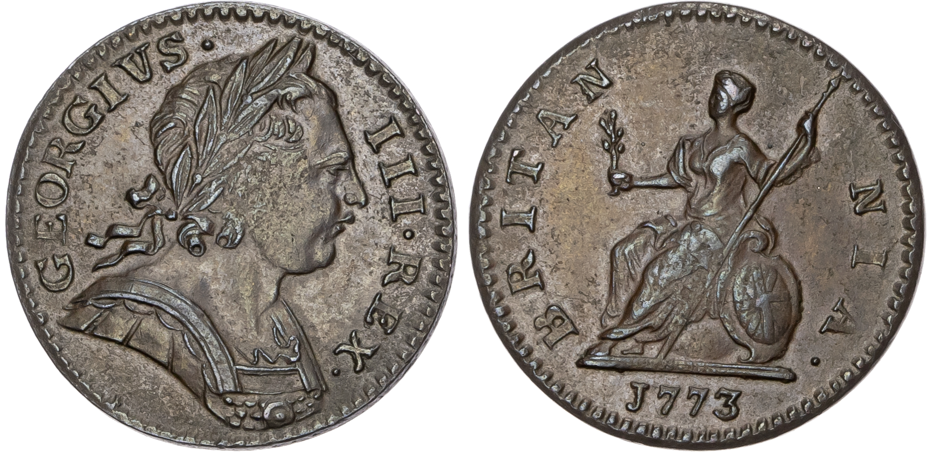 Click here to view picture 1773 Obverse 2. BMC 913. S3775. Choice Uncirculated, fields prooflike with a delightful blue tone. £275.00