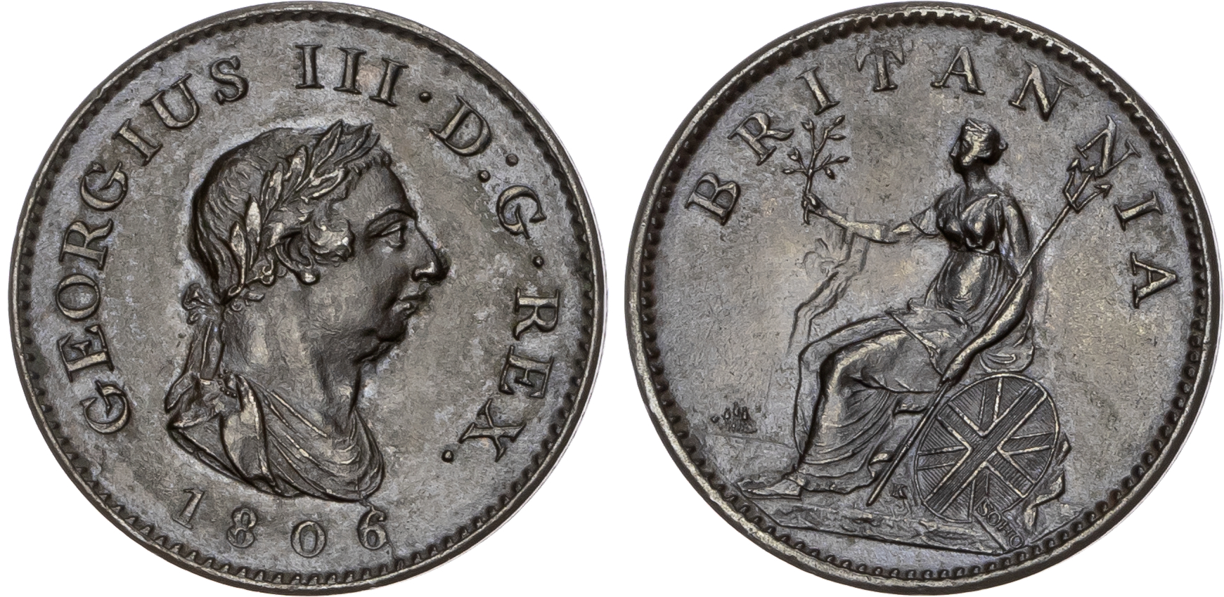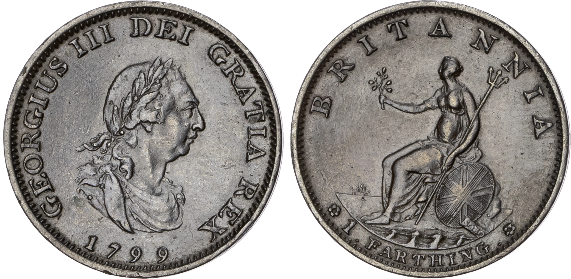 A major turning point in the nation's coinage as pioneers such as Matthew Boulton introduced new steam-powered machinery into the Mint, enabling the production of high quality, uniform coins in very large quantities. The patterns and proofs are amongst the most attractive of all coins made in the last 200 years. It was in 1797, when the Royal Mint had all but ceased any activity, that the regal copper coinage was completely re-organised due to the ingenuity and perseverance of Matthew Boulton, F.R.S. Peck's book has 175 pages devoted to this series of copper coins. Most collectors want a good representative sample of proofs, patterns and currency. The Cartwheel ¼ds of 1797 and 1798 are particularly stunning.