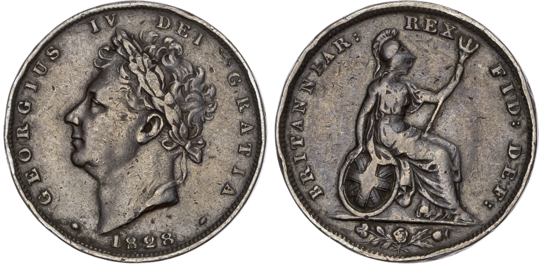 Britannia is now helmeted and for the first time faces right. The ship has sailed! Fidei Defensor makes its first appearance. This is the last reign to have the king's portrait draped.