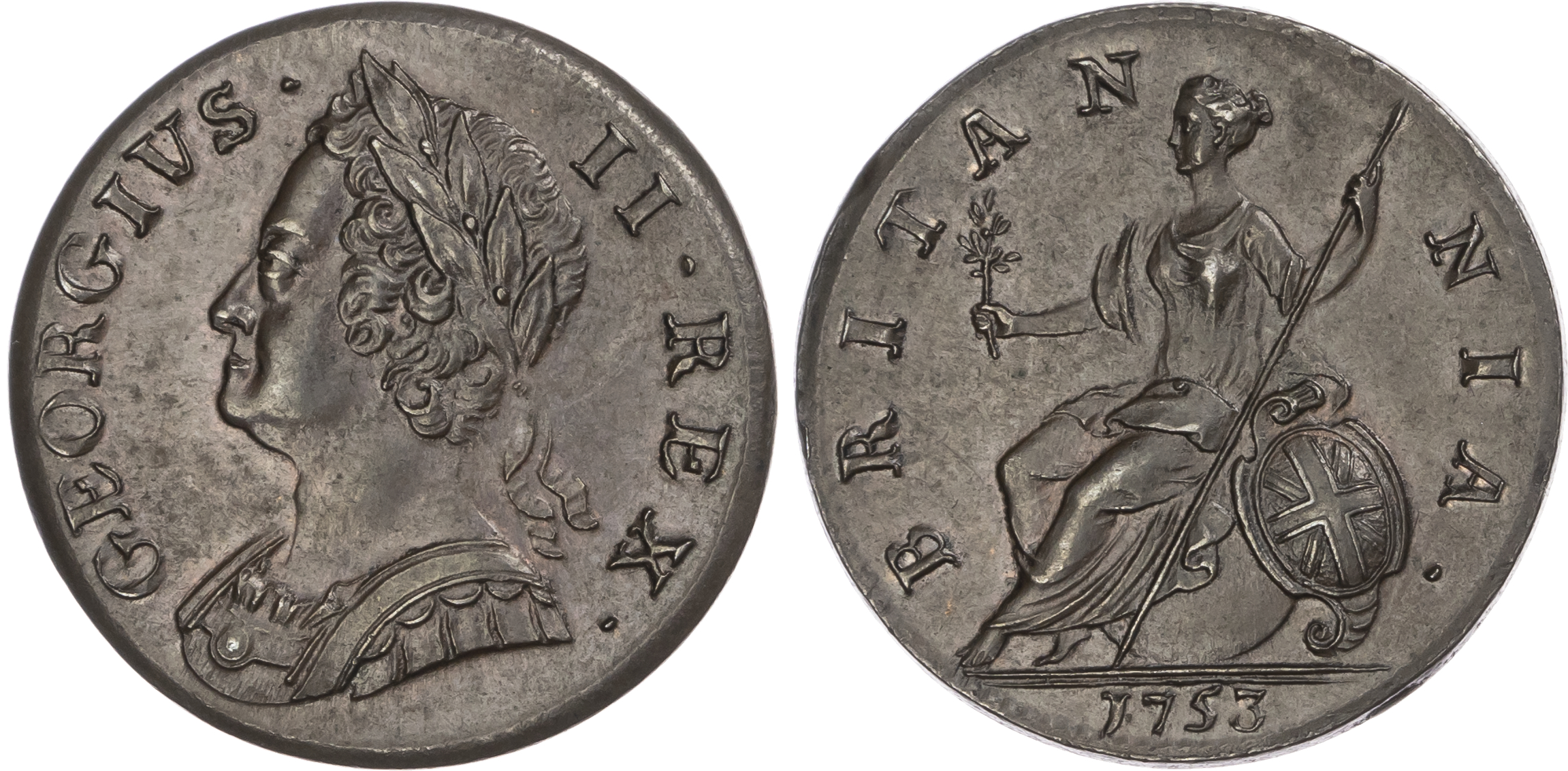 Click here to view picture 1753 George II. Second Issue - Old Head. BMC 883. S3719. Choice Unc, toned. £395.00
