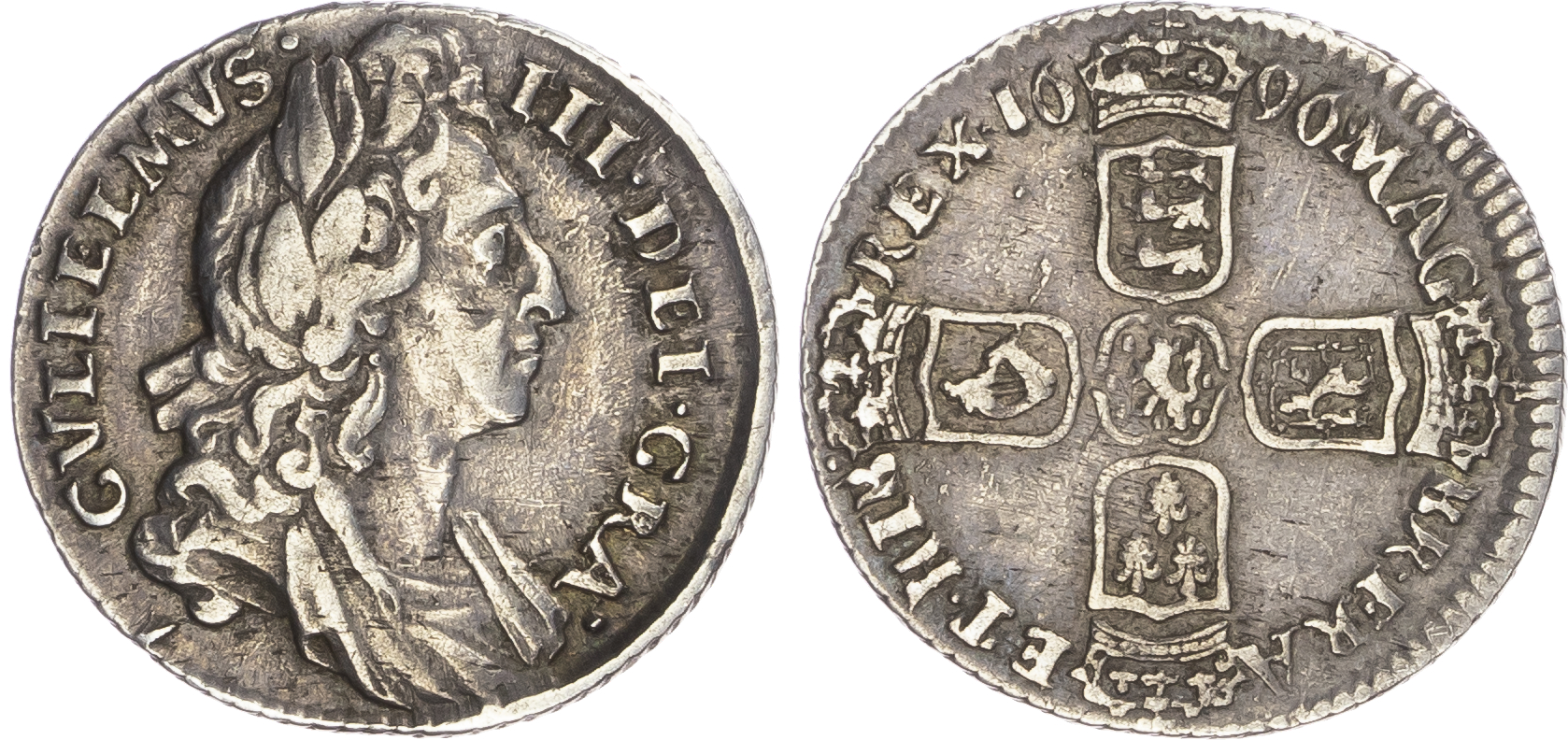 Click here to view picture 1696 NEW William III. Early harp, 1st bust. Large Crowns. S3520. ESC 1533. Near VF £50.00
