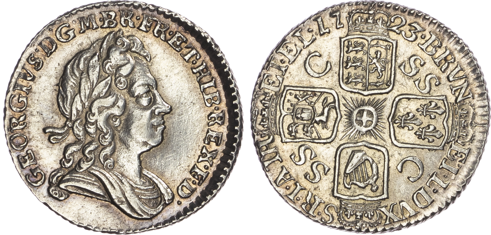 Click here to view picture 1723 NEW George I. SSC in angles. S3652. ESC 1600. Small lettering on obverse. About EF £350.00
